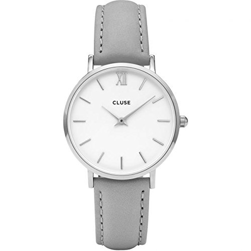 This ladies Cluse Minuit Leather watch has a stainless steel case and is powered by a quartz movement. It fastens a grey leather strap and has a white dial.