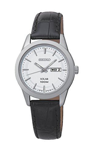 Best Seller! Ladies Women's Stainless Steel Seiko Solar Watch on Black Leather Strap with Day and Date. SUT159P2 Review