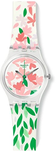 Get a fresh, new season look with the Swatch Jackarunda Watch for ladies, with its colourful floral theme of dusky pink flowers and bright green leaves.